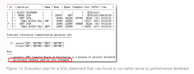 If performance feedback is used for a SQL statement then it is reported in the note section under the plan as shown in Figure 14.